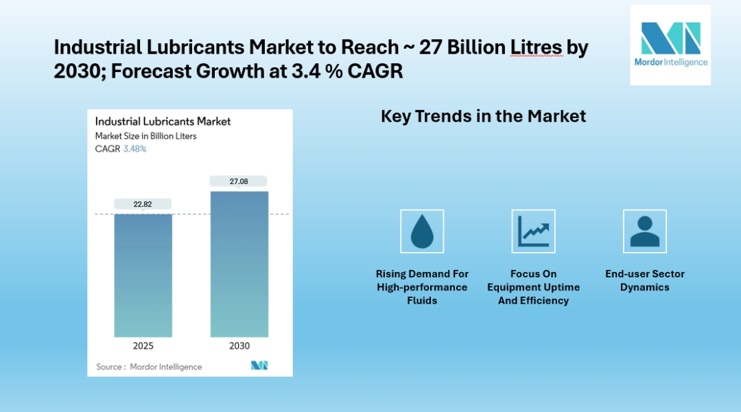The Global industrial lubricants market is expected to grow significantly in the coming years, rising from approximately 22.82 billion litres in 2025 to about 27.08 billion litres by 2030, reflecting a compound annual growth rate (CAGR) of roughly 3.48 %.