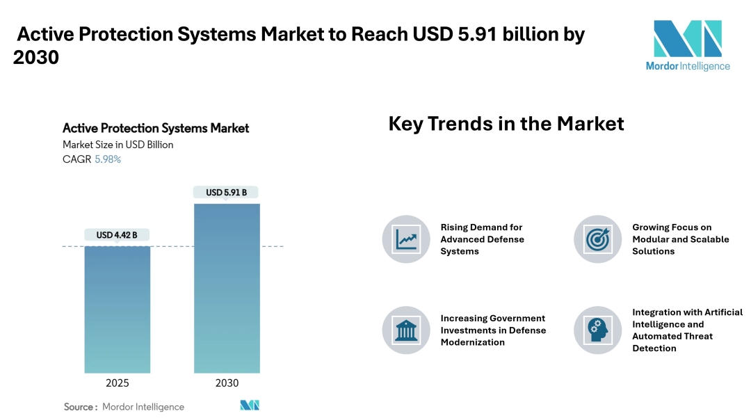 The active protection systems market size is estimated at USD 4.42 billion in 2024. It is forecasted to expand to USD 5.91 billion by 2030, advancing at a 5.98% CAGR as militaries race to harden vehicles against proliferating anti-tank guided missiles and loitering munitions. This growth is largely attributed to increasing defense modernization programs, rising cross-border conflicts, and growing investments in armored vehicle protection systems. As global defense forces prioritize crew and vehicle safety, the demand for active protection solutions that can detect, track, and neutralize incoming threats continues to rise.