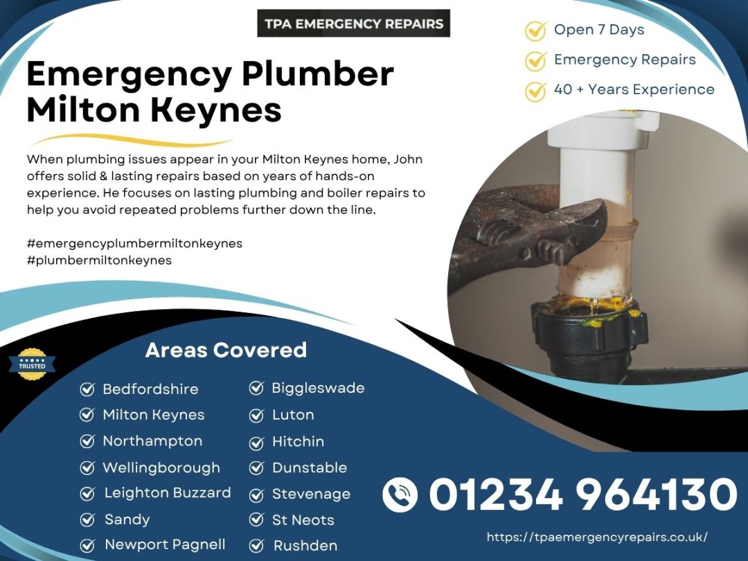 TPA Emergency Repairs, a popular plumbing and boiler repair service business based in Bedford, is strengthening its commitment to homeowners across Bedfordshire and the surrounding regions this winter as the county braces for the upcoming cold weather. Known for fast response times and professional customer service, TPA Emergency Repairs is ready to provide urgent plumbing and boiler repairs in Milton Keynes, Northampton, Bedford, Luton, Biggleswade, Wellingborough, Wollaston, Bletchley, St Neots, Hitchin, Olney, Sandy, Rushden, Leighton Buzzard, Kempston, Ampthill, Hanslope, Dunstable, Stevenage, and nearby areas. Those living in these areas can contact them if they need an emergency plumber.