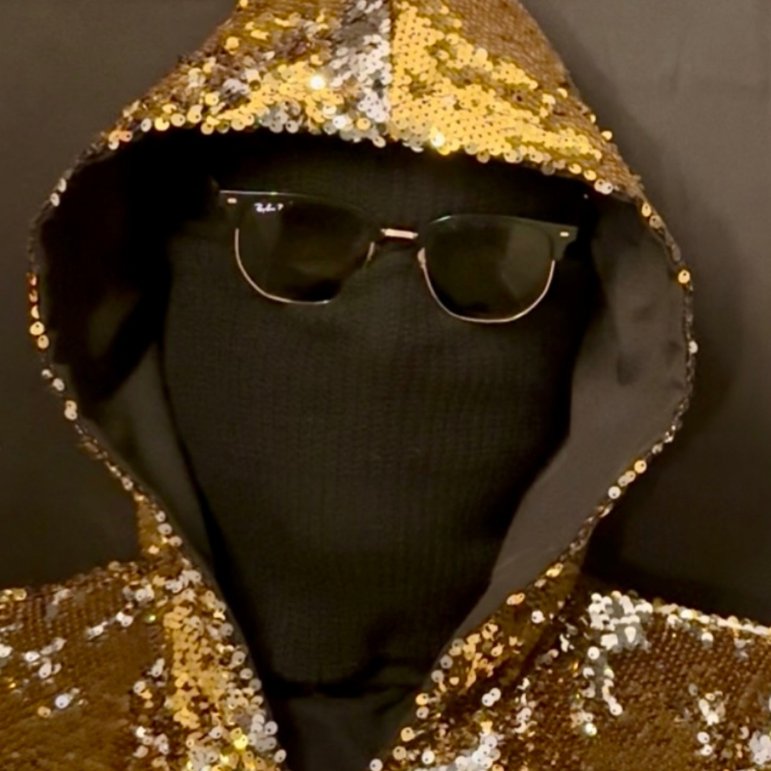 The golden hoodie and mask represent letting the work speak for itself.