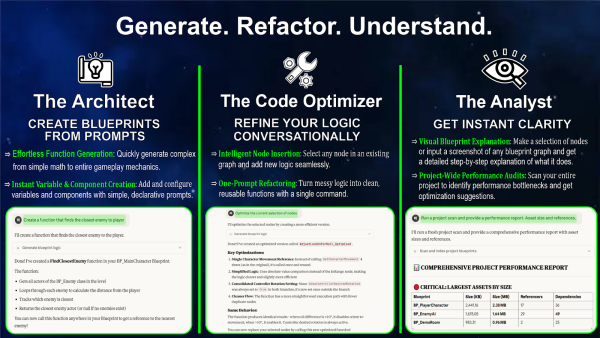 Building on the foundation of our popular Blueprint Generator, this isn't just an update, it's a complete paradigm shift. We’ve transformed a simple generator into a comprehensive, project-aware AI development assistant. This is the story of how we built the ultimate AI Copilot for Unreal Engine, and how it will fundamentally change the way you create.