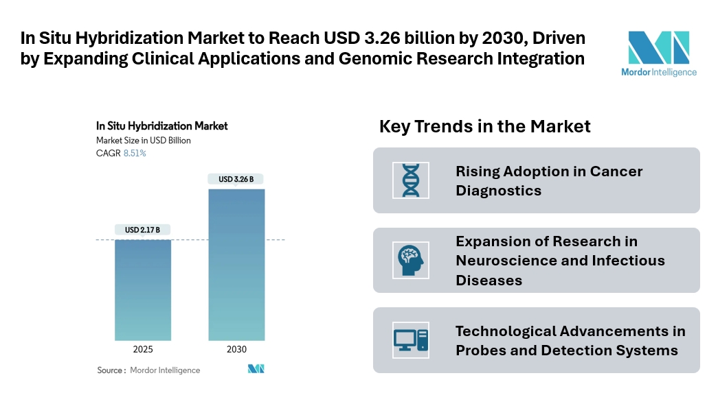 The In Situ Hybridization Market size is estimated at USD 2.17 billion in 2025, and is expected to reach USD 3.26 billion by 2030, at a CAGR of 8.51% during the forecast period (2025-2030). Growth is supported by the increasing prevalence of cancer, advancements in diagnostic imaging, and the integration of automated hybridization systems in molecular pathology. The rising use of fluorescence in situ hybridization (FISH) and chromogenic in situ hybridization (CISH) techniques across clinical diagnostics, pharmaceutical R&D, and academic research continues to strengthen the global market outlook.