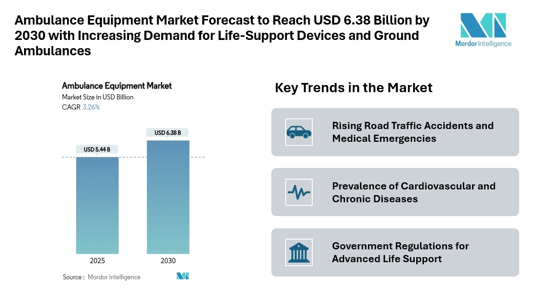 The ambulance equipment market size stands at USD 5.44 billion in 2025 and is forecast to reach USD 6.38 billion by 2030, advancing at a 3.26% CAGR over the period, reflecting a consistent demand for advanced medical equipment in pre-hospital care. This growth is driven by rising road traffic incidents, increasing prevalence of chronic and cardiovascular diseases, and expanding government mandates for advanced life-support standards in ambulances. North America currently dominates the market in terms of share, while the Asia-Pacific region is witnessing the fastest growth due to rapid expansion of emergency medical service infrastructure.