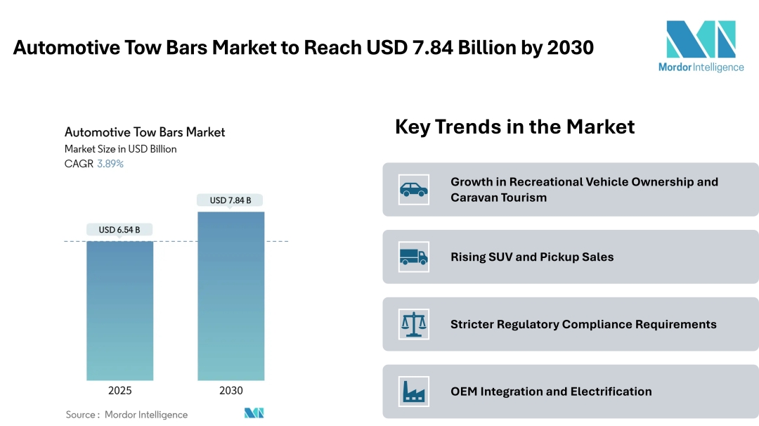 The Automotive Tow Bars Market is experiencing steady growth, with the market size projected to increase from USD 6.54 billion in 2025 to USD 7.84 billion by 2030, registering a CAGR of 3.89% during the forecast period. Growth is supported by rising SUV and pickup sales, increasing recreational vehicle ownership and caravan tourism, and stricter regional certification regulations reinforcing the need for compliant towing solutions. The adoption of electric vehicles and integration of towbar systems with modern vehicle platforms further contributes to market expansion. North America holds a significant share, driven by established trailer-sharing platforms and outdoor activity culture, while Asia-Pacific is emerging as the fastest-growing region due to rising vehicle ownership and infrastructure development.