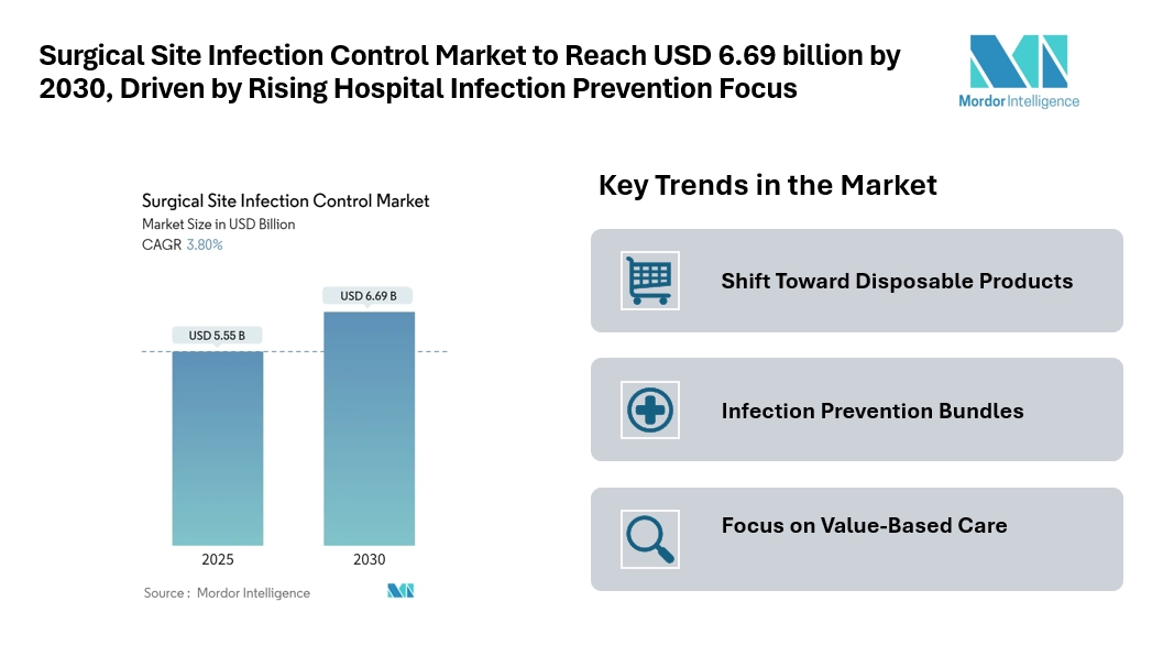 The surgical site infection control market is witnessing steady growth as healthcare providers place stronger emphasis on reducing post-operative complications and improving patient safety outcomes. According to Mordor Intelligence, The Surgical Site Infection Control Market size is estimated at USD 5.55 billion in 2025, and is expected to reach USD 6.69 billion by 2030, at a CAGR of 3.8% during the forecast period (2025-2030), reflecting sustained demand from hospitals, ambulatory surgical centers, and specialty clinics worldwide. The increasing number of surgical procedures and rising awareness of infection-related risks continue to support the overall surgical site infection control market growth.