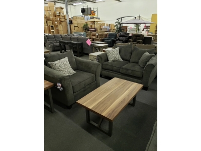 A large furniture warehouse showroom displays various living room sets, including a dark gray armchair and loveseat with patterned pillows centered around a light wood coffee table.
