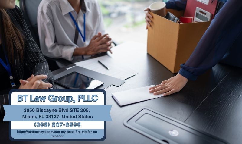 MIAMI, FL - Florida's at-will employment doctrine allows employers to terminate employees without providing a reason, but federal and state laws establish critical exceptions that protect workers from illegal termination. Miami employment law attorneys Jason D. Berkowitz and Anisley Tarragona of BT Law Group, PLLC (https://btattorneys.com/can-my-boss-fire-me-for-no-reason/) are clarifying when at-will terminations cross the line into wrongful termination under discrimination and retaliation laws.