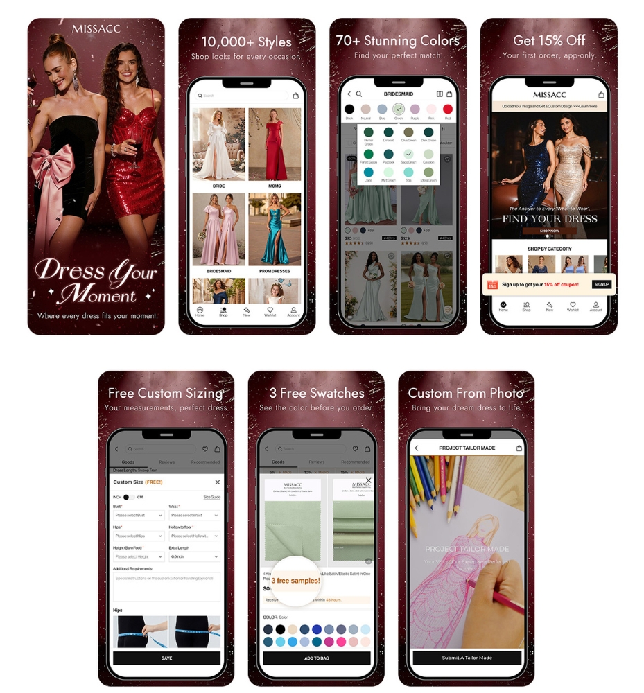 The app integrates Missacc’s custom-fit capabilities, including made-to-measure sizing and personalized design options, in a streamlined mobile flow. Rather than emphasizing volume, the focus is on helping customers feel confident in their choices, especially when shopping for important life moments.