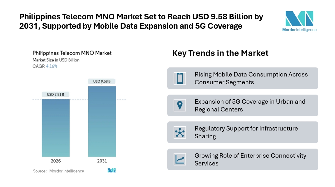 The Philippines Telecom MNO Market growth continues to reflect steady expansion as mobile services remain central to digital connectivity across the country. According to Mordor Intelligence, the market is estimated at USD 7.81 billion in 2026, rising from USD 7.5 billion in 2025, and is projected to reach USD 9.58 billion by 2031. This growth outlook is supported by sustained demand for mobile data, wider availability of advanced network services, and ongoing policy measures aimed at improving coverage and service quality.