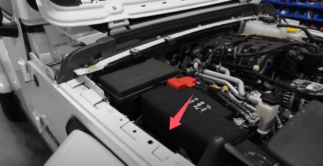 Open your Rubicon’s hood and head to the driver’s side near the battery. You’ll find a small wire bundle tucked away and wrapped in black tape. This is the factory aux switch output. Carefully remove some tape to reveal the pre-labeled wires.