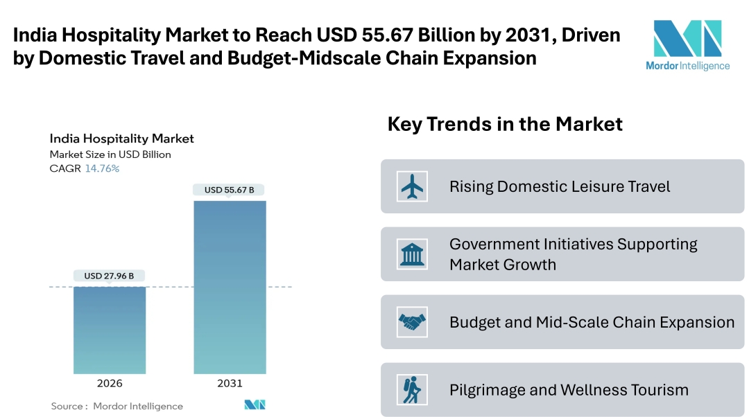 According to Mordor Intelligence, the India hospitality market size is on a remarkable growth trajectory, reaching USD 27.96 billion in 2026 and projected to hit USD 55.67 billion by 2031. This represents a strong compound annual growth rate (CAGR) of approximately 14.76% over the forecast period. Key drivers include a growing domestic travel base, increasing middle-class disposable incomes, and improvements in both air and road connectivity, which are making travel more frequent and accessible.