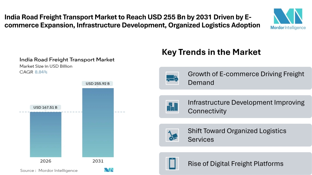 According to Mordor Intelligence, the India road freight transport market size is estimated at USD 167.51 billion in 2026, increasing from USD 153.9 billion in 2025, and is projected to reach USD 255.92 billion by 2031, registering a CAGR of 8.84% during the forecast period. This steady India road freight transport market growth reflects the country’s strong economic activity, expanding manufacturing base, rising consumption, and continuous infrastructure investments. The India road freight transport industry plays a critical role in ensuring smooth domestic and international cargo movement