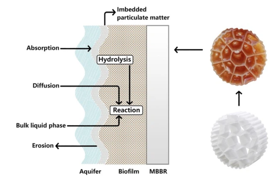 MBBR Technology: Working Principle and AdvantagesCompared to traditional biofiltration technologies such as trickling filters and rotating biological contactors, MBBR offers distinct advantages in terms of operational simplicity and maintenance efficiency. Widely adopted in European wastewater treatment plants and aquaculture facilities of all scales, MBBR is an attached-growth biological treatment process that operates continuously as a low-headloss, non-clogging reactor.The core of the MBBR system lies in its specialized carrier media, which provide a high specific surface area for biofilm growth without the need for backwashing. Bacterial communities colonize these media, which move freely within the reactor volume—driven by diffused aeration (for aerobic nitrification) or submerged mechanical mixers (for anoxic denitrification). This free movement creates a self-cleaning effect, preventing clogging and facilitating controlled biofilm sloughing, which maintains consistent treatment efficiency.Key characteristics of MBBR systems include: