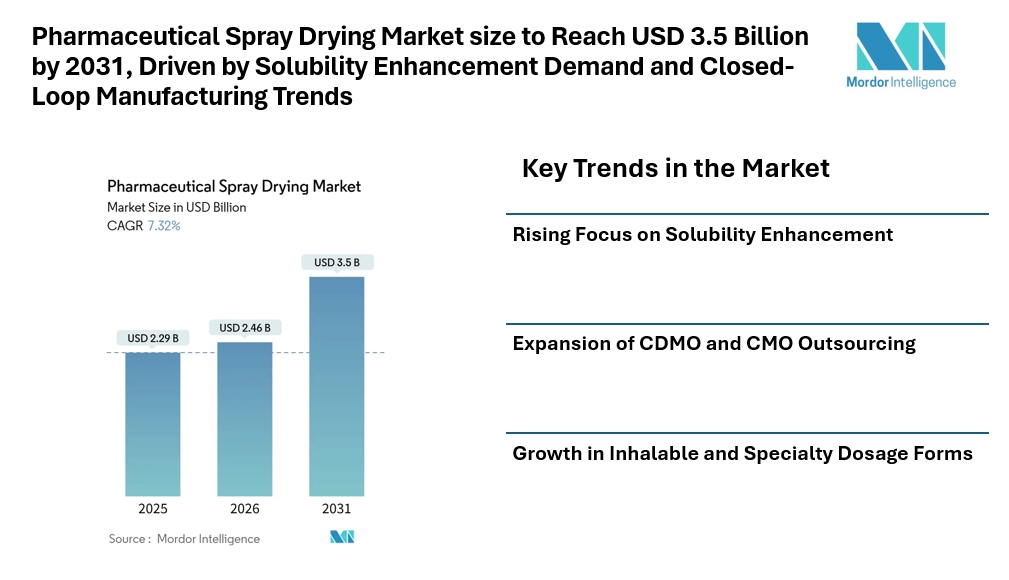 According to Mordor Intelligence, the pharmaceutical spray drying market size was valued at USD 2.46 billion in 2026 to reach USD 3.5 billion by 2031, registering a CAGR of 7.32% during the forecast period. The steady rise in poorly soluble drug candidates, increasing outsourcing to contract manufacturers, and rising adoption of inhalable and specialty formulations continue to support pharmaceutical spray drying market growth.