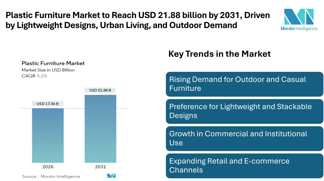 According to Mordor Intelligence, the plastic furniture market size is expected to grow from USD 16.80 billion in 2025 to USD 17.56 billion in 2026 and is forecast to reach USD 21.88 billion by 2031 at 4.5% CAGR over 2026-2031, reflecting consistent demand across both developed and emerging economies. Growth is supported by changing lifestyle patterns, increasing urbanization, and rising preference for cost-effective furniture solutions.