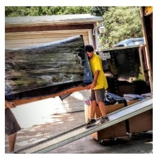 The image shows two people in yellow shirts moving a large, wrapped item down a ramp from a truck.