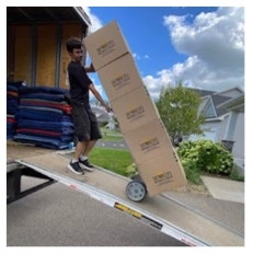 The image shows a person moving a stack of boxes down a ramp from a truck.