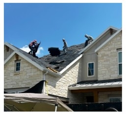 The image shows workers on a roof, removing old shingles as part of a roofing job.