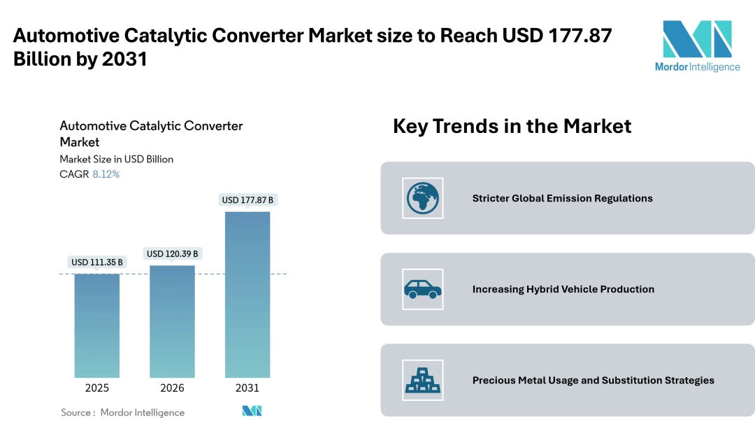 According to Mordor Intelligence, the automotive catalytic converter market size is estimated at USD 111.35 billion in 2025 and is projected to reach USD 120.39 billion in 2026, with the automotive catalytic converter market forecast indicating growth to USD 177.87 billion by 2031. The market is expected to grow at a CAGR of 8.12%, reflecting consistent demand for emission control systems across passenger and commercial vehicles.