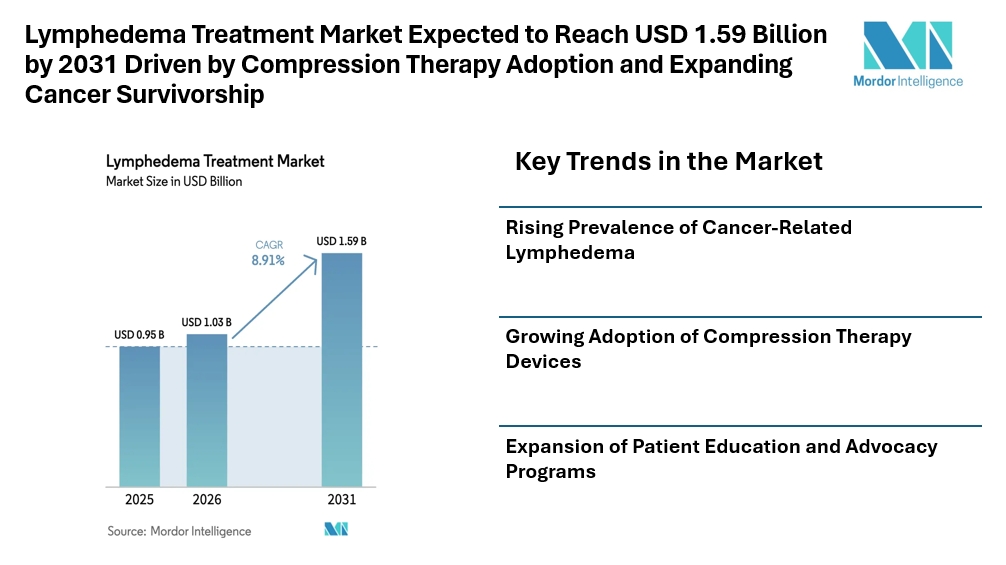 According to Mordor Intelligence, the lymphedema treatment market size is projected to grow from USD 0.95 billion in 2025 to USD 1.03 billion in 2026, and it is expected to reach USD 1.59 billion by 2031, reflecting consistent lymphedema treatment market growth during the forecast period.