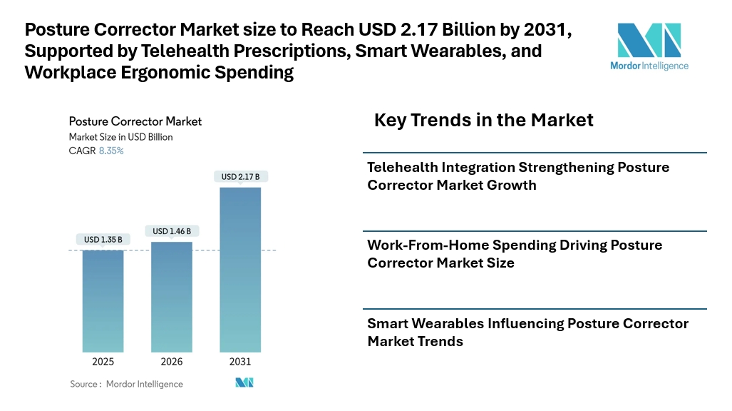 According to Mordor Intelligence, the posture corrector market size is projected to grow from USD 1.35 billion in 2025 to USD 1.46 billion in 2026 and reach USD 2.17 billion by 2031, reflecting steady posture corrector market growth during the forecast period. The expansion of hybrid work models, rising musculoskeletal complaints, and wider acceptance of telehealth-based posture assessments are shaping the posture corrector market forecast.