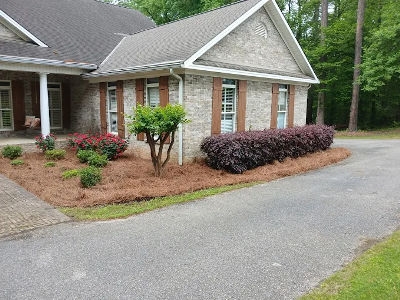 The image features a well-maintained home with neat landscaping. Shrubs and flowers are carefully arranged around the front yard, with fresh pine straw covering the garden beds, adding to the home's curb appeal. The house sits in a peaceful, wooded neighborhood, creating a warm and inviting atmosphere.